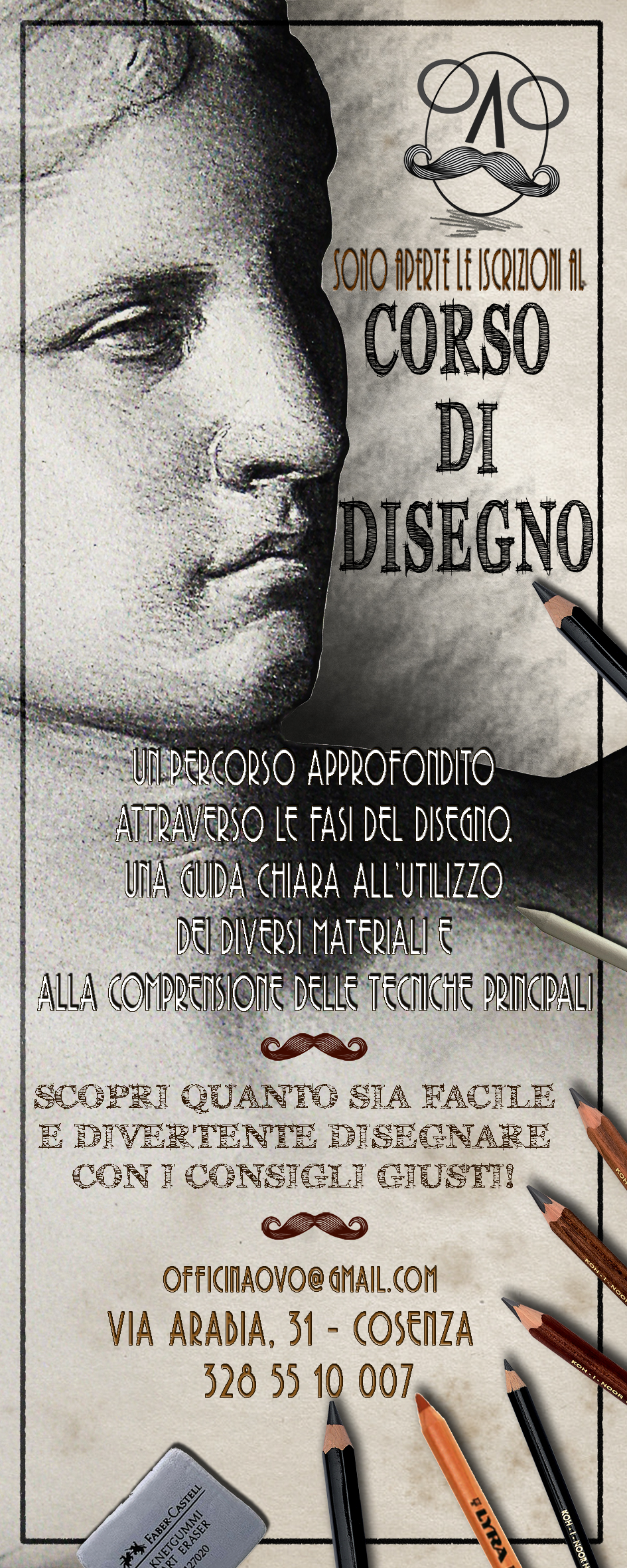Strutturato in un percorso semplice e pratico, fa ottenere risultati notevoli fin dalle prime lezioni, sviluppando di volta in volta tutti gli aspetti e le tecniche fondamentali del disegno (impostazione, anatomia, prospettiva, chiaroscuro etc.) attraverso una programmazione divertente e versatile, che permette di individuare e sviluppare le proprie inclinazioni personali e conferisce la sicurezza necessaria a proseguire autonomamente o a intraprendere percorsi di specializzazione professionale. Il corso inizia il 13 Ottobre 2015, alle ore 19:00: per prenotazioni e informazioni officinaovo@gmail.com o 328 55 10 007